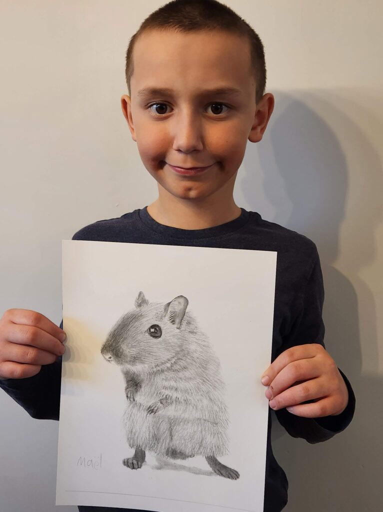 Je m’appelle Maël, j’ai 11 ans et je fais des dessins réalistes en noir et blanc au crayon de bois
